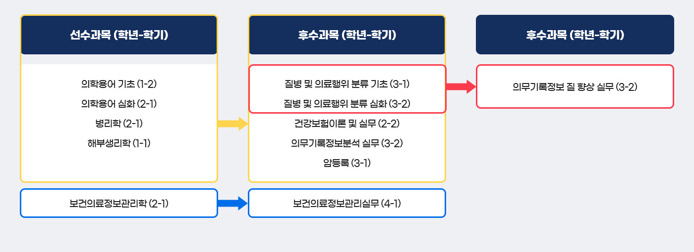 - 의학용어, 병리학, 해부생리학 교과목은 질병 및 의료행위 분류, 의무기록정보 분석 실무, 의무기록정보 질 향상 실무, 암등록, 건강보험 이론 및 실무의 선수 교과목임