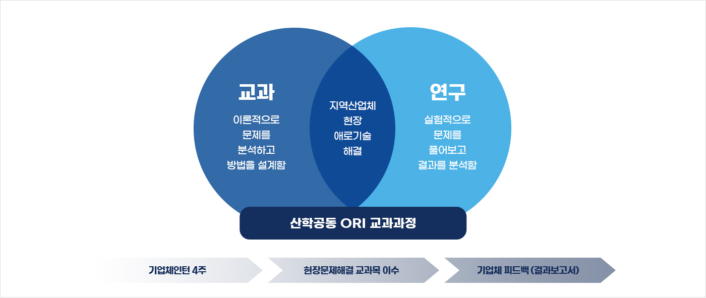 산학공동 ORI (On Regional Industry) 교과를 통한 현장실무형 엔지니어를 양성함 (현장실습 필수 ➡ 현장문제해결 교과 이수 ➡ 문제해결보고서 작성)