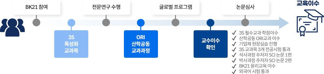 - 석사: 초정밀 화학소재 특성화 교과과정은 3S 특성화 교과목 12학점 이상 필수, ORI 교과목 3학점 필수, 연구학점 2학점을 포함해서 총 26학점 이수를 석사 졸업 전까지 만족해야 함