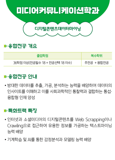 학사안내 열린 미래 꿈이있는 대학, 동아대학교 메인으로 이동 학사안내 학과소개 학사안내 학생활동 대학원 회원서비스 열린광장 마이페이지 기타 닫기 교과과정 교과과정 학사일정 교내행사 닫기 AI·SW 융합전공 교과과정 마이크로모듈 AI·SW 융합전공 닫기 학사안내 학사안내 교과과정 교과과정 마이크로모듈 AI·SW 융합전공 학사일정 교내행사 교과과정 마이크로모듈 AI·SW 융합전공 AI·SW 융합전공 SNS 목록열기 FACEBOOK 공유하기 TWITTER 공유하기 BLOG 공유하기 SNS 목록닫기 인쇄 url 복사 동아대학교 소프트웨어 중심사업을 통해 미디어커뮤니케이션학과는 디지털콘텐츠데이터마이닝 융합전공으로 4차산업혁명을 선도하는 융합형 인재양성 커리큘럼을 운영하고 있습니다.