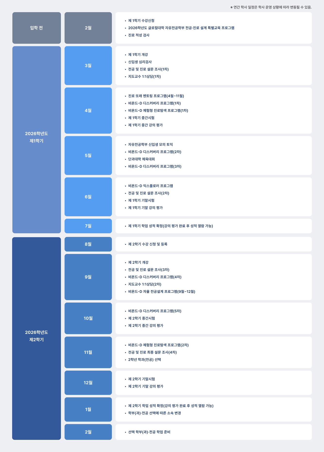 학과소개 열린 미래 꿈이있는 대학, 동아대학교 메인으로 이동 학과소개 대학소개 학과소개 학사안내 교육 프로그램 안내 학생자치조직 소개 정보광장 닫기 자유전공학부 자유전공학부 융합전공 닫기 학사안내 학부소개 학사안내 닫기 학사일정 학사일정 이수체계도 게시판 자료실 교과과정 장학제도 닫기 학과소개 학과소개 자유전공학부 학부소개 학부소개 교육목표 5대 역량 교수진소개 학사안내 학사일정 이수체계도 게시판 자료실 교과과정 장학제도 융합전공 전공소개 전공소개 교육과정표 프로그램 소개 졸업 후 진로 및 취업 학사안내 학사일정 게시판 자료실 학부소개 학사안내 학사안내 SNS 목록열기 FACEBOOK 공유하기 TWITTER 공유하기 BLOG 공유하기 SNS 목록닫기 인쇄 url 복사 학사일정 이수체계도 게시판 자료실 교과과정 장학제도 <자유전공학부 월간 로드맵 (2026)>