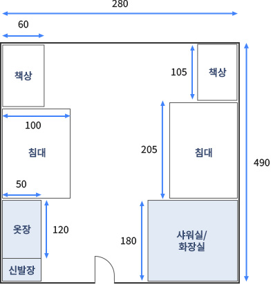 생활관 소개 DONG-A UNIVERSITY 메인으로 이동 생활관 소개 생활관 소개 생활관안내 통합정보시스템 한림광장 자치회 닫기 생활관 스케치 설립목적 시설개요 가족소개 생활관둘러보기 찾아오시는길 생활관 소식 생활관 스케치 닫기 생활관 소개 생활관 소개 설립목적 시설개요 가족소개 생활관둘러보기 찾아오시는길 생활관 소식 생활관 스케치 생활관 스케치 SNS 목록열기 FACEBOOK 공유하기 TWITTER 공유하기 BLOG 공유하기 SNS 목록닫기 인쇄 url 복사 승학관 부민관 구덕관 부민관 사생실 도면(2인실 기준) 사이즈 가로x세로 cm책상 60x105침대 100x205[매트리스 90x200]옷장(2인용) 50x120방구조마다 1-2cm 차이가 있음
