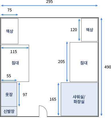 생활관 소개 DONG-A UNIVERSITY 메인으로 이동 생활관 소개 생활관 소개 생활관안내 통합정보시스템 한림광장 자치회 닫기 생활관 스케치 설립목적 시설개요 가족소개 생활관둘러보기 찾아오시는길 생활관 소식 생활관 스케치 닫기 생활관 소개 생활관 소개 설립목적 시설개요 가족소개 생활관둘러보기 찾아오시는길 생활관 소식 생활관 스케치 생활관 스케치 SNS 목록열기 FACEBOOK 공유하기 TWITTER 공유하기 BLOG 공유하기 SNS 목록닫기 인쇄 url 복사 승학관 부민관 구덕관 구덕관 사생실 도면(2인실 기준) 사이즈 가로x세로 cm책상 75x120침대 115x205[매트리스 110x200]옷장(2인용) 55x97방구조마다 1-2cm 차이가 있음