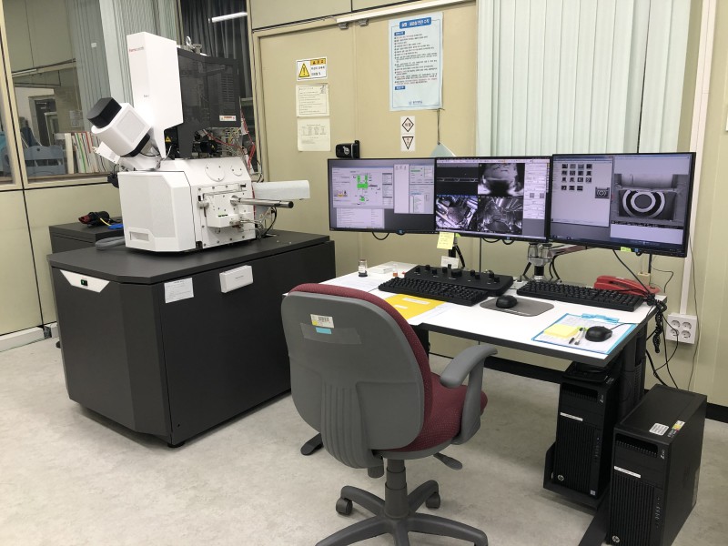 집속이온빔 조사 장치로 나노단위의 시료를 가공하여 FESEM 및 EDS 분석이 가능한 장비. 영역분할 BSE detector와 대물렌즈 내/외부의 SE detector(4개)를 활용하여 자성시료 등 소재 특성에 최적화된 관찰 모드 제공.
