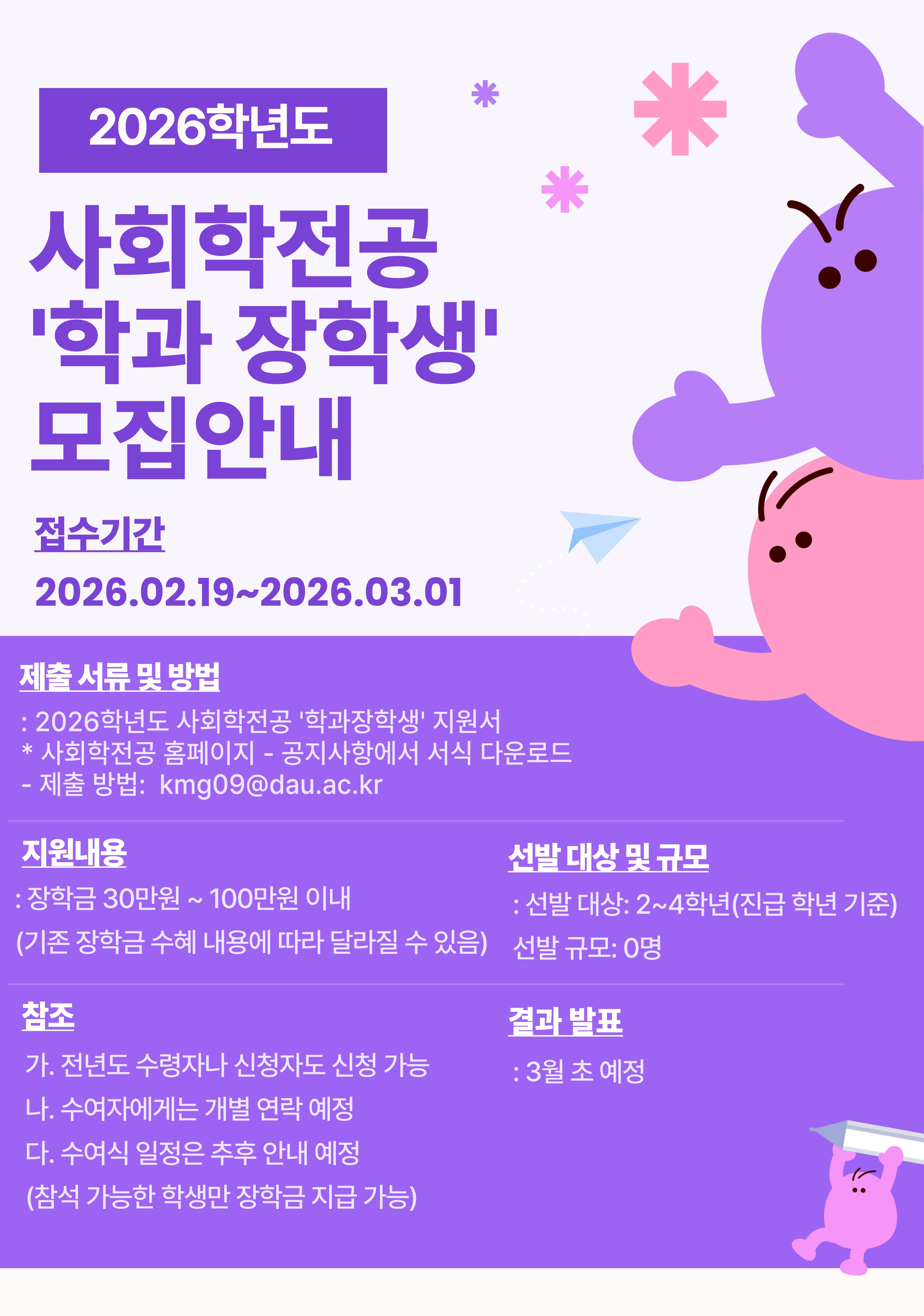 | 학과장학금 | 장학기금 | 지원자에 한하여 학과 심사 후 선발 | 총 500만원 *연도별로 상이할 수 있음 |