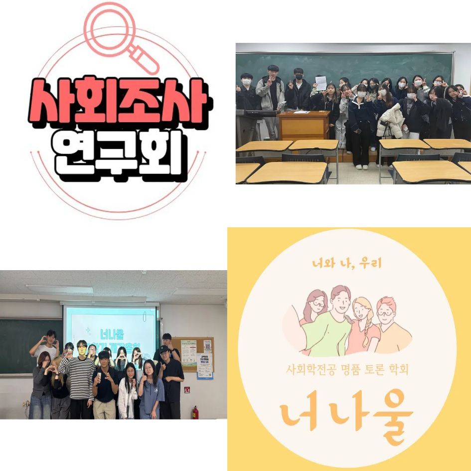 사회학전공에서는 학과 교과과정과 연관지어 학회 활동을 꾸준히 이어나가고 있습니다. 사회조사분석사 2급 취득을 위해 학습 활동을 진행하는 사회조사연구회, 그리고 토론 학회인 너나울로 구성되어 있습니다.