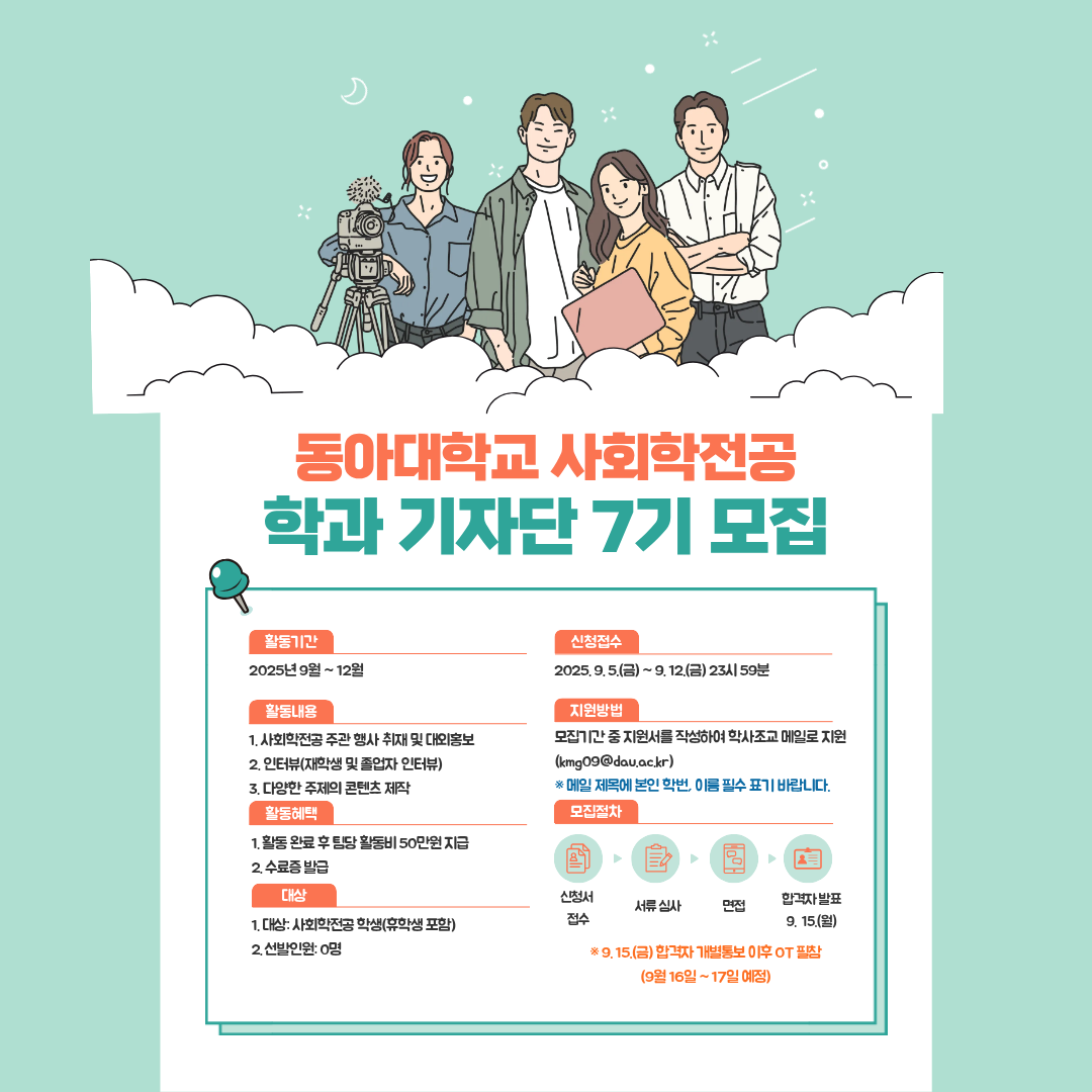 사회학전공에서는 학과 기자단을 운영하여 언론 진출 스터디 커리큘럼 교과과정을 토대로 학생들의 기량을 더 발전시키고자 하며 원활한 활동을 위해 활동비도 함께 지원하고 있습니다.