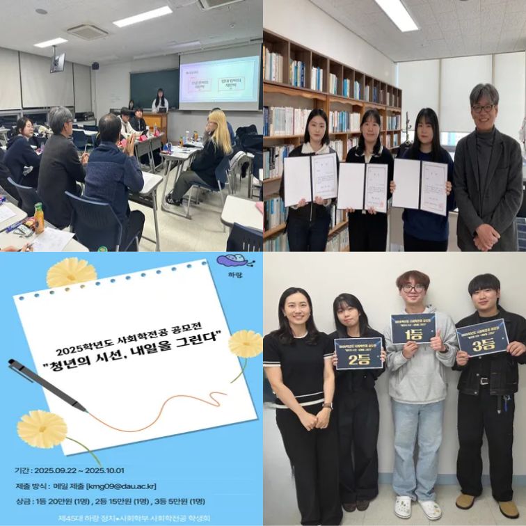 사회학전공에서는 학생들이 학과 교과과정을 토대로 학생들의 역량을 한 층 더 강화시킬 수 있도록 1년에 1번씩 학과 공모전 활동 또는 사회담론회를 개최하고 있으며, 우수 학생들에게 시상금도 지급을 하고 있습니다.
